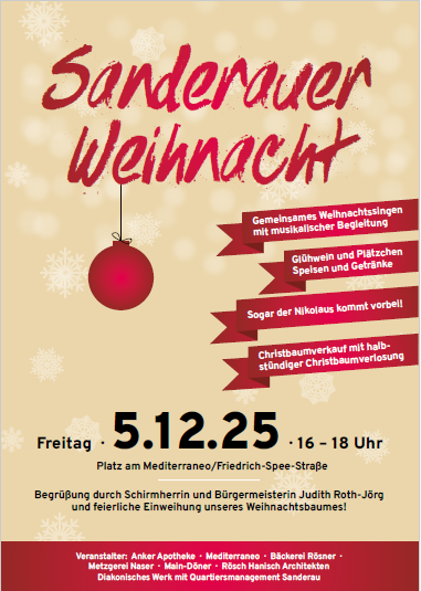In der Sanderau ist wieder Weihnachtszeit. Auch heuer findet am 5.Dezember ab 16:00Uhr ein stimmungsvoller Weihnachtsmarkt auf dem Platz vor dem beim Restaurant Mediterraneo statt. Eröffnet wird dieser von Schirmherrin Judith Roth-Jörg mit einer Ansprache. Weihnachtsmelodien erklingen und der Duft von Glühwein liegt in der Luft. Neben Leckereien gibt es für die Kleinen wieder eine Überraschung vom Nikolaus. In diesem Jahr erwartet Sie außerdem ein Christbaumverkauf direkt vor Ort. Und als besonderes Highlight findet alle 30 Minuten eine Christbaumverlosung statt - einfach vorbeikommen, mitmachen und mit ein bischen Glück einen Christbaum mit nach Hause nehmen!