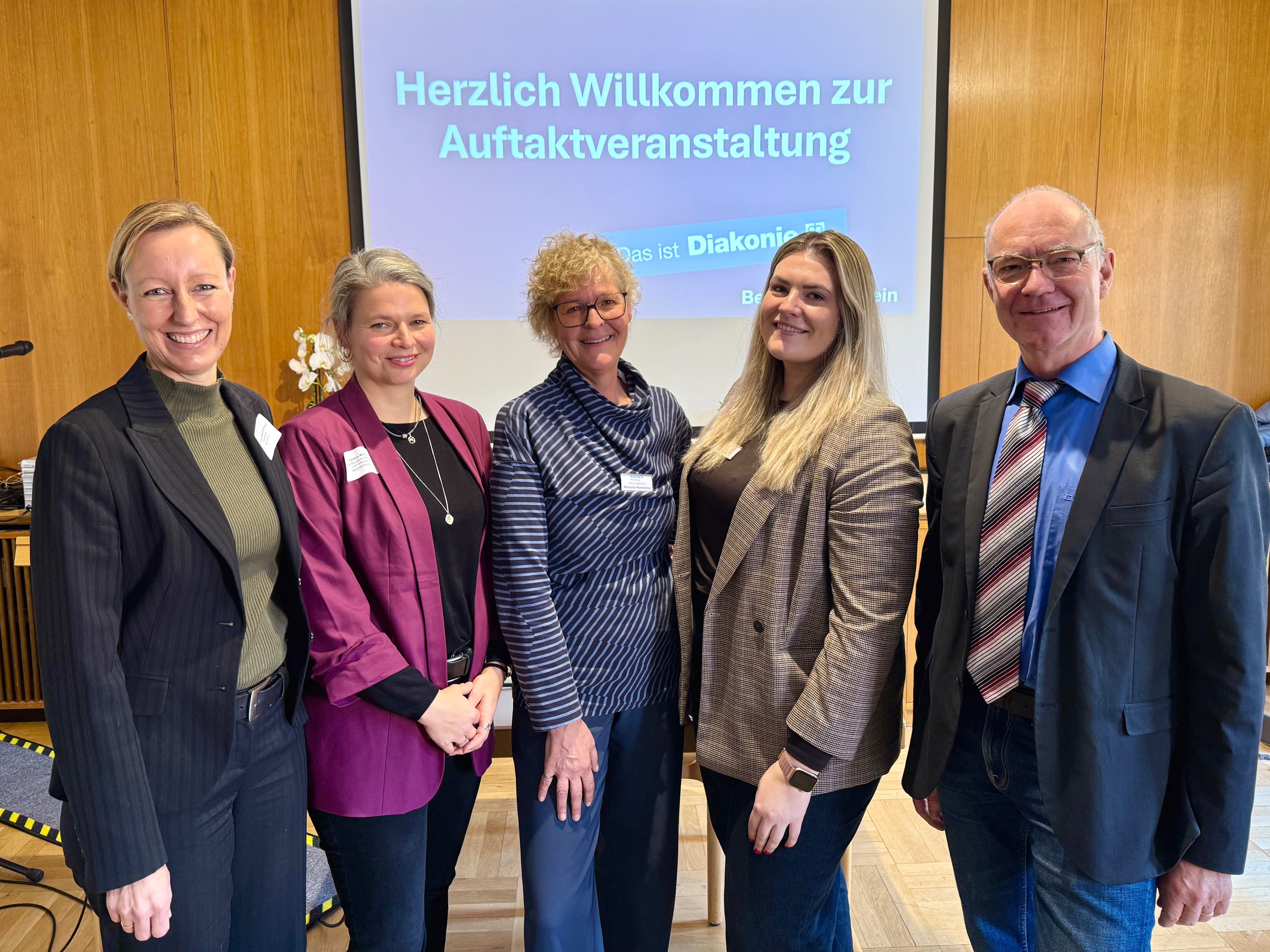v. links: Eva von Vietinghoff-Scheel, Würzburger Sozialreferentin, Karoline Wirth, Rechtliche Betreuung und Vorsorge, Stadt Würzburg, Natascha Waskiewicz, Leiterin des Betreuungsvereins mit Vereinsbetreuerin Sophia Böhm und Andreas Schrappe, Vorstand der Diakonie (Foto: Stephanie Rau, Inline Internet & Werbeagentur GmbH)