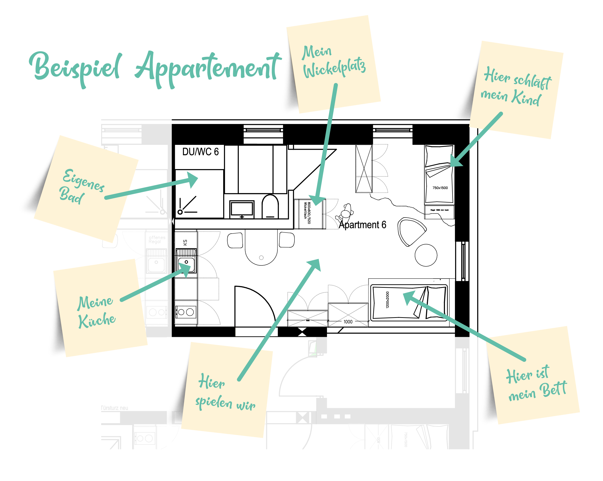 Alle Appartements sind unterteilt in einen Wohn- und Essbereich, einem Bereich für die Mutter und einem Bereich für das Kind.